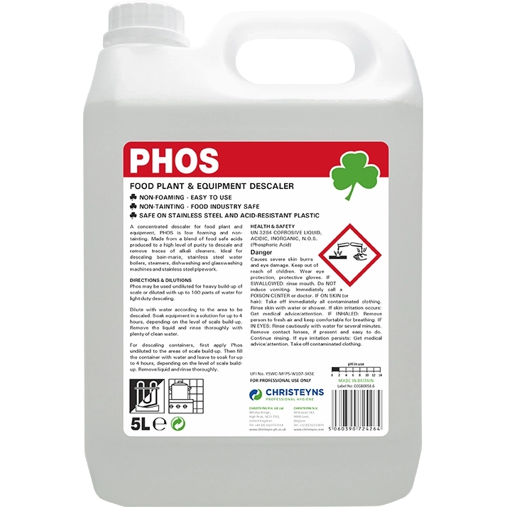 Food Plant Descaler Phos is a concentrated descaler for food plant and equipment, which is low foaming and non-tainting. Made from a blend of food safe acids produced to a high level of purity to descale and remove traces of alkali cleaners.Ideal for descaling bain-marie, stainless steel water boilers, steamers, dishwashing and glasswashing machines and stainless steel pipework.For use in the food and catering industry.