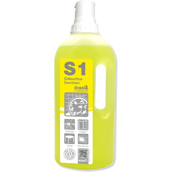 Dose It S1 Odourless Sanitiser is a portable dosage control system, that requires no dispensing equipment, as the dosage control cap cleanly and safely dispenses 20mls of sanitiser providing strict portion control and an alternative to static dosing systems. This also means no splash or spill when pouring. Dose It Odourless Sanitiser creates 50 trigger sprays of ready to use solution per bottle, meaning that it is extremely economical in use. S1 Odourless Sanitiser: Is the same as Trio 100, only in a Dose It 1 litre bottle for greater economy of use. Is an odourless, neutral sanitiser that is ideal for daily disinfection. Cleans and sanitises all hard surfaces safely – use on a regular basis for cleaning and disinfecting work surfaces, equipment, walls, etc. Kills 99.999% of bacteria and is very effective against MRSA, Salmonella, E.coli and Pseudomonas Aeruginosa. Is non-fragranced. Is pH neutral and can be used on all washable surfaces – wood, glass, plastic, aluminium, stainless steel and other water washable surfaces. Safe in food areas – certified to BS EN 1276. Directions for use Clean heavily soiled areas with D1 prior to disinfection. Apply to surfaces using a mop, spray, cloth or other equipment. Contact Time: 60 seconds* Wipe off or rinse away with water *For dirty areas allow a contact time of 5 minutes. pH: 7-8 Size: 1L