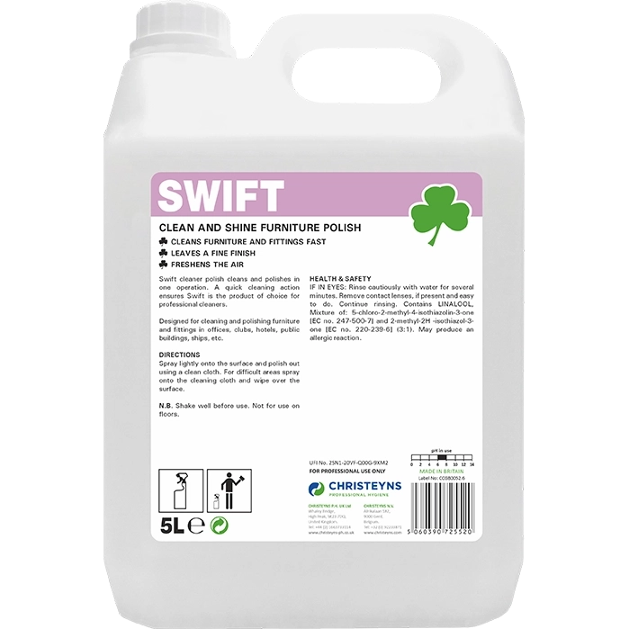Clean & Shine Furniture Polish. A ready-to-use clean and shine furniture polish, which cleans and polishes in one application. An emulsion of cleaning agents and silicones in an aqueous base, Swift leaves a fine finish and freshens the environment with a sophisticated fragrance. Designed for cleaning and polishing modern furniture and fittings, including glass surfaces. Ideal for use in hotels, offices, nursing homes and public buildings, Swift is the product of choice for professional cleaners.