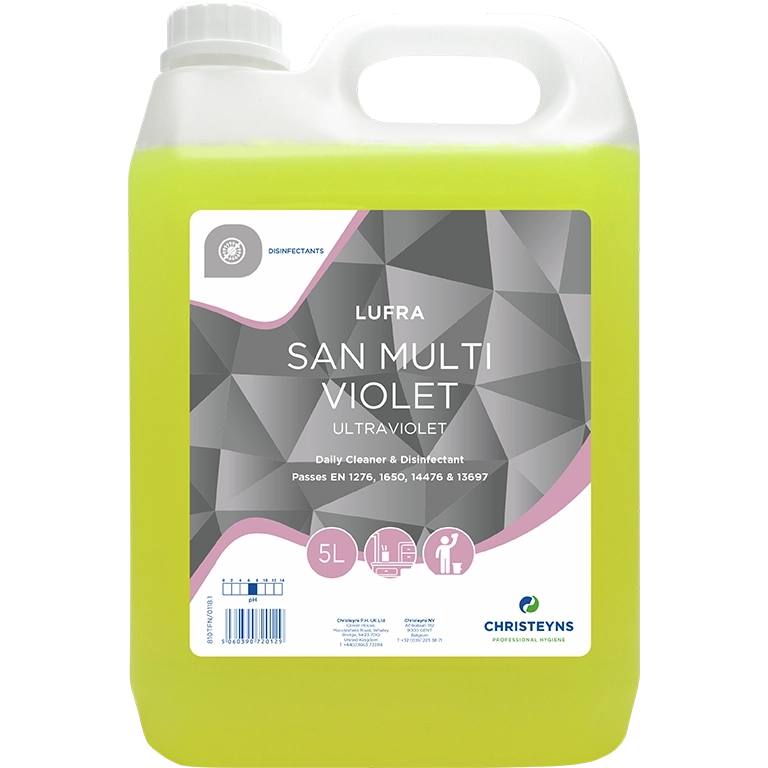 Perfumed Cleaner Disinfectant. Kills MRSAA neutral cleaner and disinfectant with a popular violet fragrance. Kills 99.999% of bacteria. Tested to BS EN 1276 at a dilution of 1:40 by an independent laboratory. Ultra violet is a clear yellow liquid that is low foaming in order to rinse easily from surfaces. Suitable for use by hand or in a scrubber drier. As a neutral product, Ultraviolet cleans and disinfects all hard surfaces safely. Ultraviolet is safe for use on all surfaces including stainless steel. Use to clean sinks, taps, baths, walls, doors, floors, fittings and fixtures, toilets, bidets and urinals.